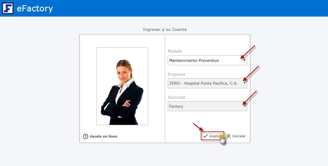 a. Al iniciar eFactory con nuestro Usuario y Contraseña, Seleccionamos el Módulo