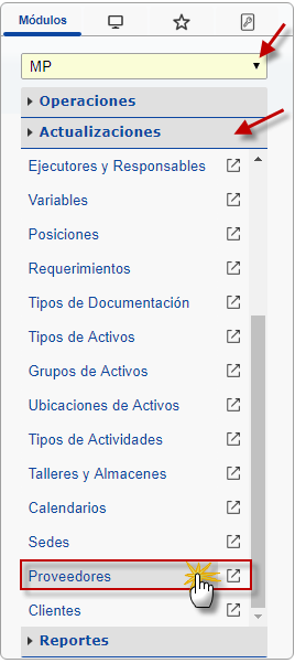 b. En el módulo MP, desplegamos el componente Actualizaciones y activamos el sub. componente Proveedores.