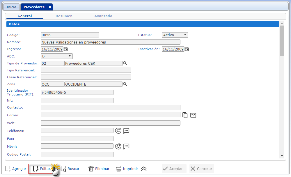 d. Luego se muestra en la pantalla la ficha de datos del proveedor buscado el cual podemos actualizar cómodamente los datos del proveedor y para finalizar seleccionaremos el botón