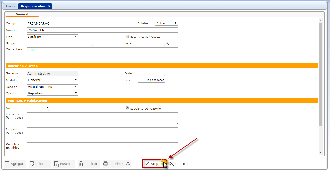 b. En el módulo MP, desplegamos el componente Actualizaciones y activamos el sub. componente Requerimientos.