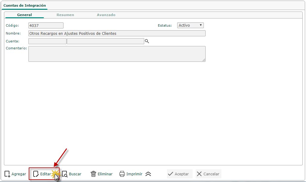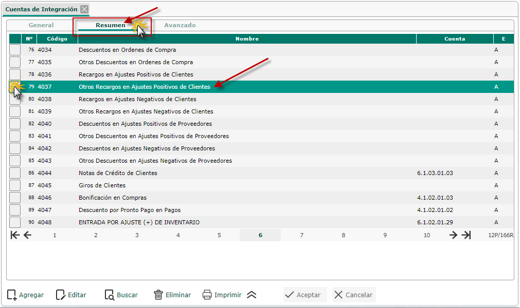 b. Luego de haber seleccionado la opción de Cuentas de Integración se muestra la pantalla donde presionaremos la ficha resumen para buscar