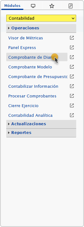 a. Seleccionar el módulo Contabilidad y al desplegar la sección de Operaciones seleccionaremos la opción de Comprobante de Diario.