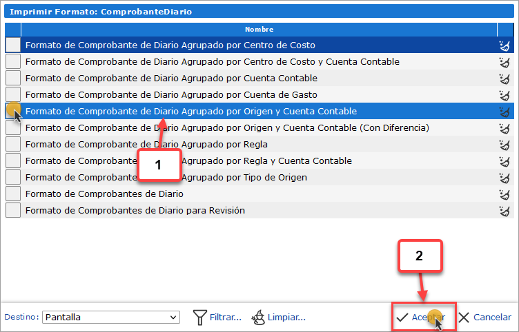 se mostrará el formato del Comprobante de Diario seleccionado.