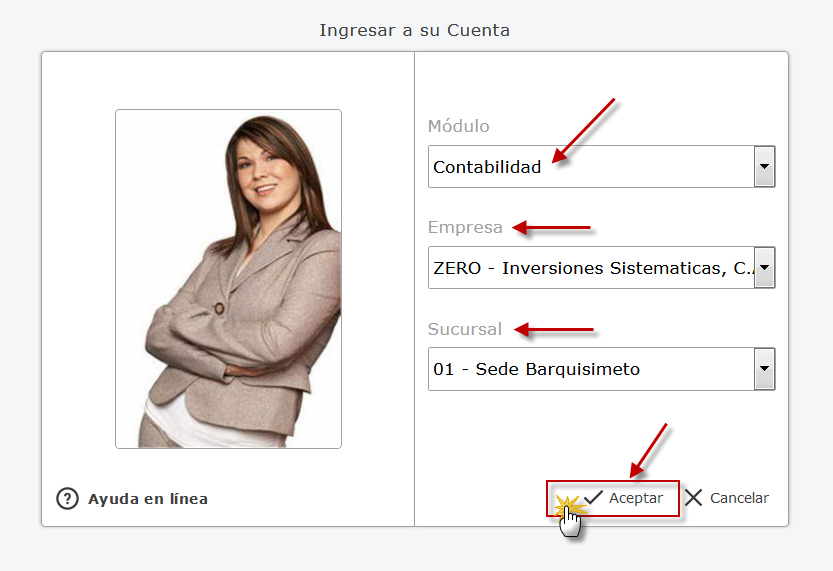 Primero debemos ingresar al sistema de contabilidad de eFactory colocando nuestro usuario y contraseña en la pantalla inicial de eFactory, luego presionaremos el botón de "Iniciar Sesión" y seleccionaremos el sistema de "Contabilidad",