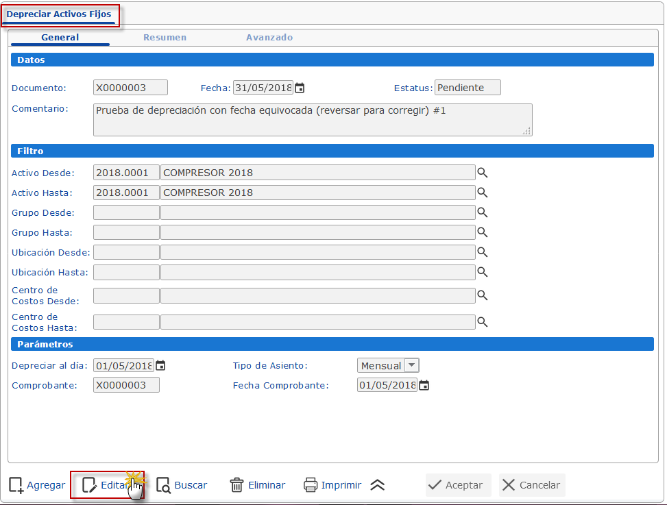 NOTA: Para poder corregir una depreciación de activo fijo este deberá tener un monto de adquisición o la fecha de adquisición y valor de salvamento equivocado.