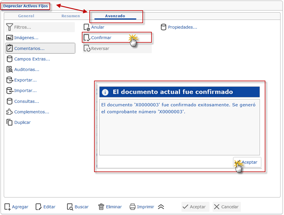 a. Primero seleccionaremos en la ventana de Depreciar Activos Fijos la pestaña de Avanzado y presionaremos el botón
