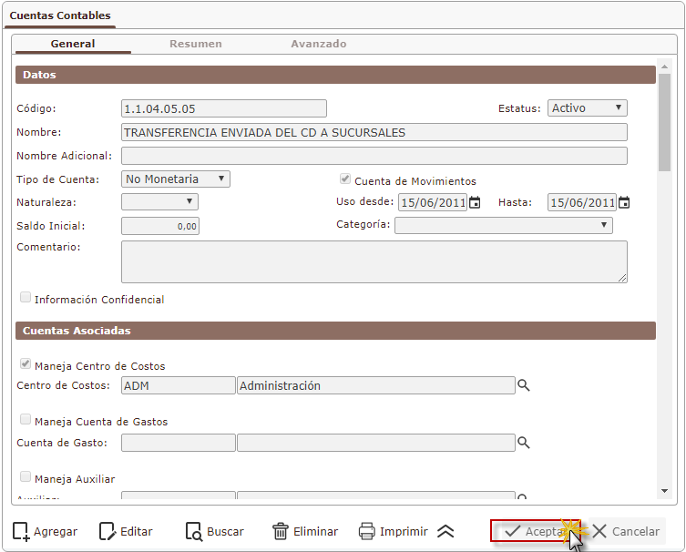 Luego de completar los campos de cuentas contables, presionaremos el botón