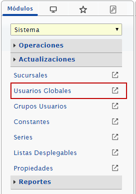 b. Después nos ubicamos en el menú, presionaremos la opción módulo donde se despliega la lista y seleccionamos el módulo de Sistema, desplegamos el componente Actualizaciones y activamos el maestro de Usuarios Globales.