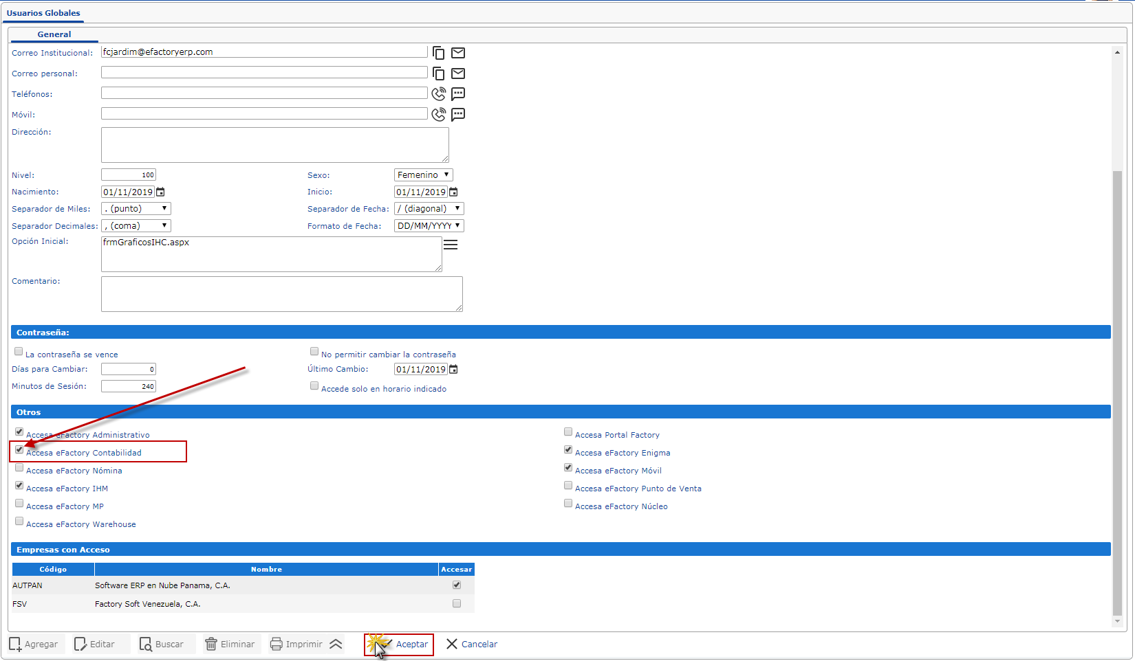 b. Luego se muestra el formulario y para darle acceso a eFactory Contabilidad nos ubicamos en la Sección Otros y marcamos la casilla de Accesa eFactory Contabilidad