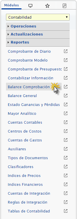 b. Para emitir un Balance de Comprobación tenemos que ubicar el módulo de Contabilidad, desplegamos el componente Reportes, activamos el maestro Balance de Comprobación.