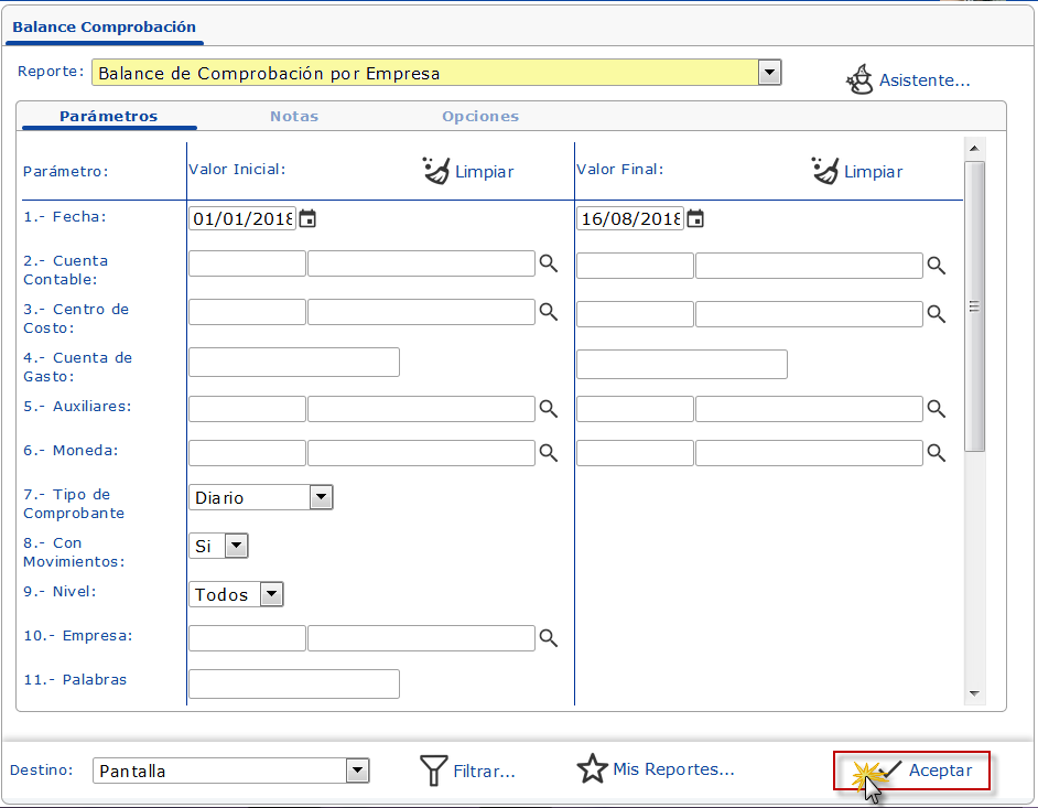 Balance de Comprobación por Empresa, especificamos los parámetros necesarios y presionamos el botón