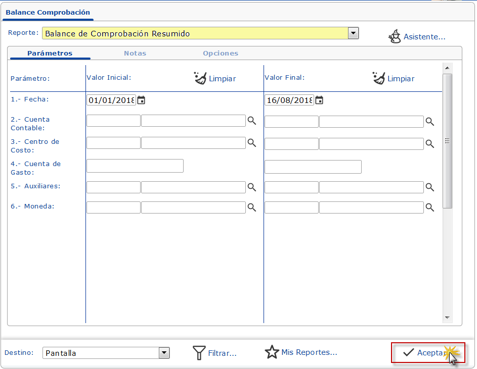 Balance de Comprobación Resumido, especificamos los parámetros necesarios y presionamos el botón