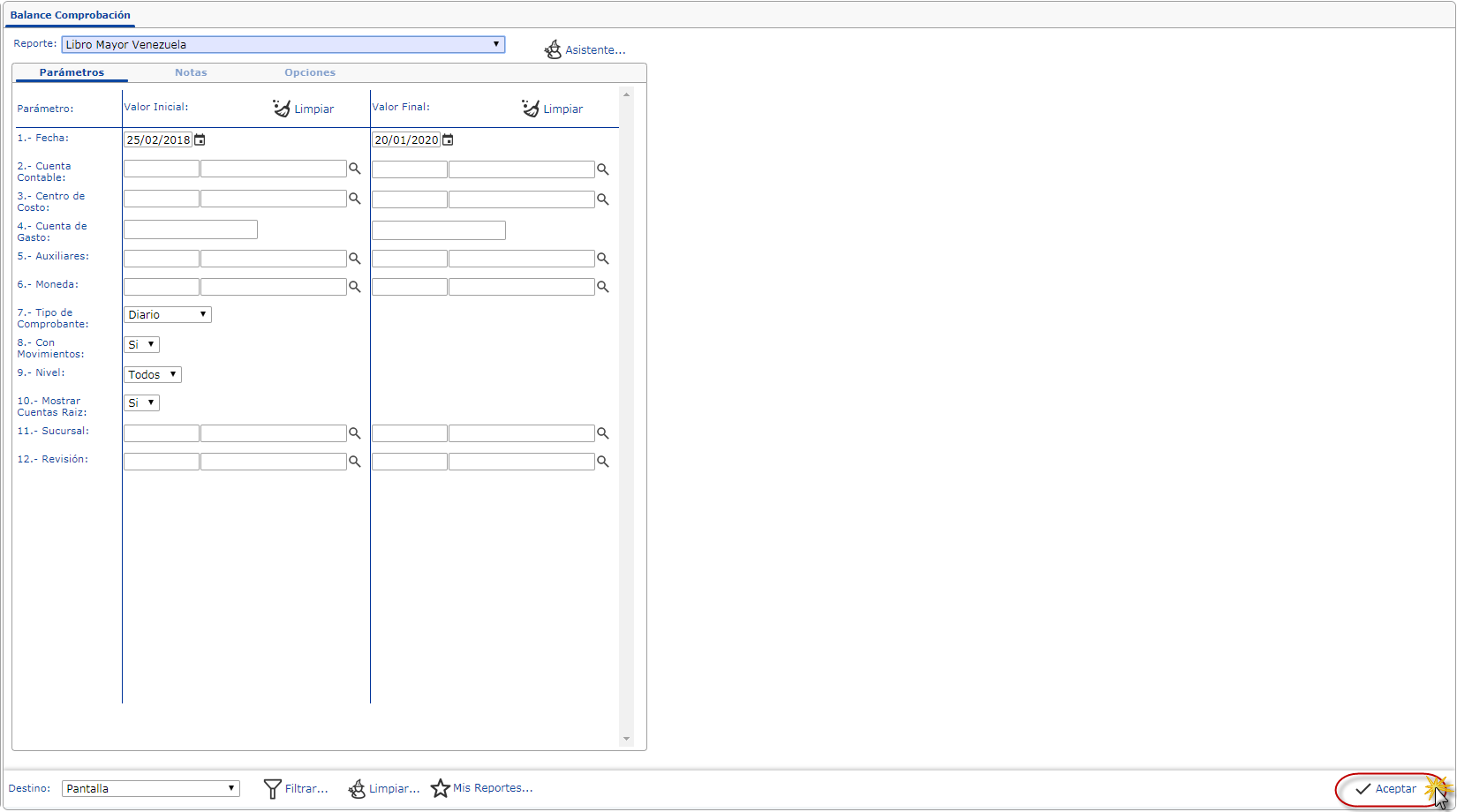 Libro Mayor Venezuela, especificamos los parámetros necesarios y presionamos el botón