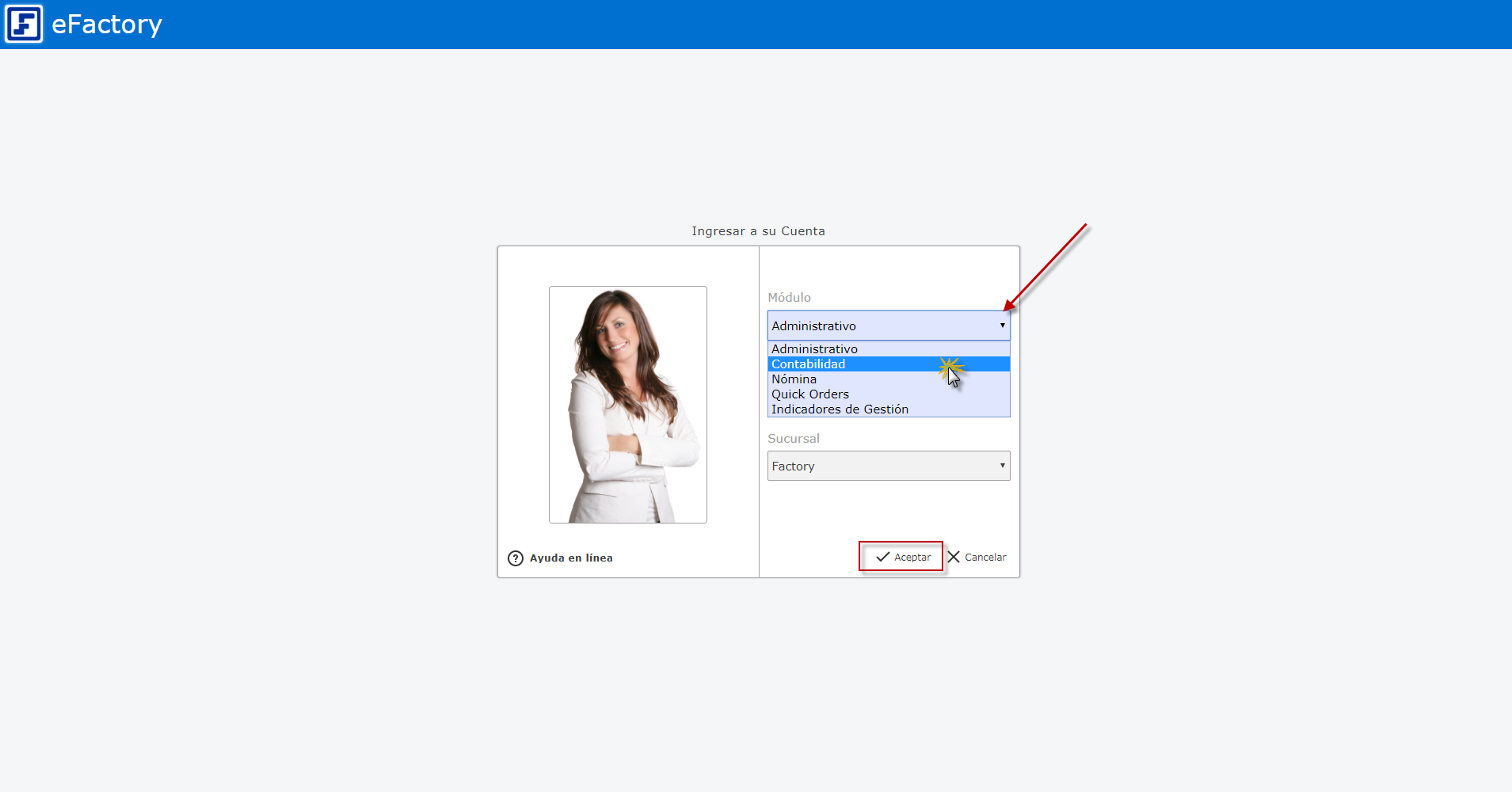 a. Ingresamos a eFactory con nuestro Usuario, Contraseña y presionaremos el botón