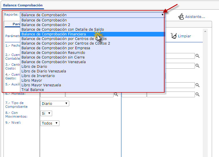 a. Después de seleccionar Balance de Comprobación Financiera podemos observar la ficha correspondiente donde procedemos a completar los campos que son: