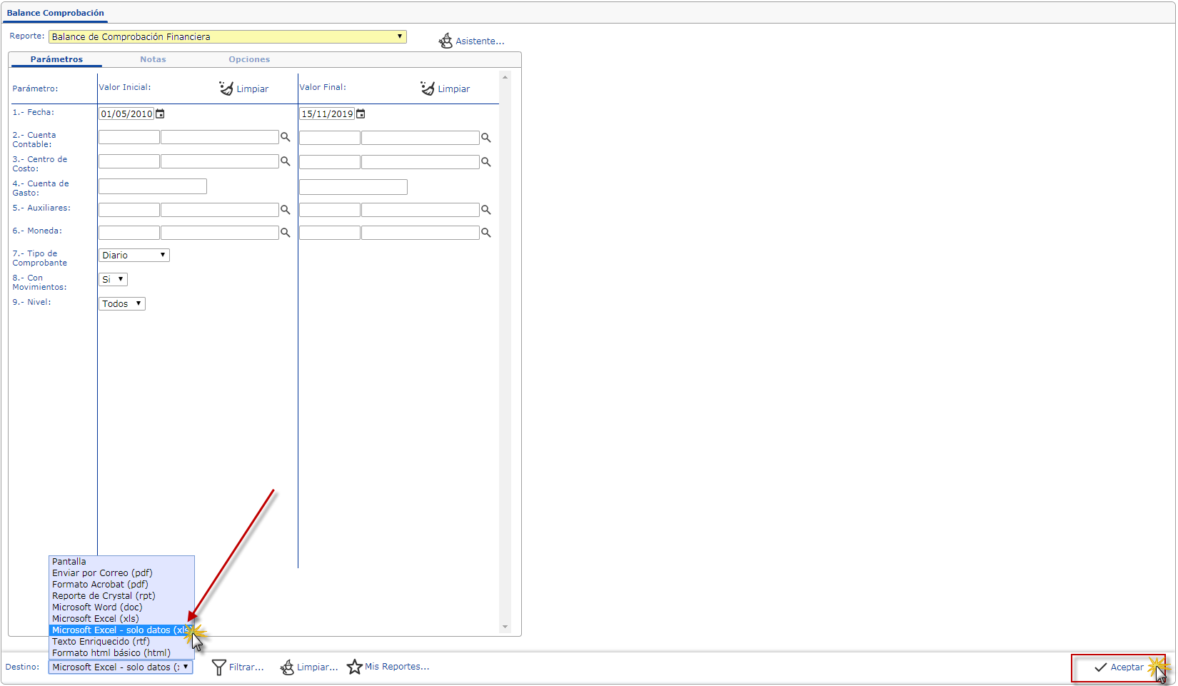 También tenemos el campo Destino donde seleccionaremos en la lista desplegable Microsoft Excel - solo datos(xls)