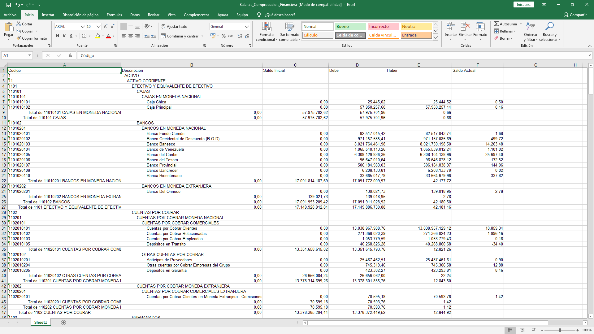 a. Luego al abrir el archivo podemos observar detalladamente el balance de comprobación financiera a excel, como el código, descripción, saldo inicial, debe, haber, saldo actual.