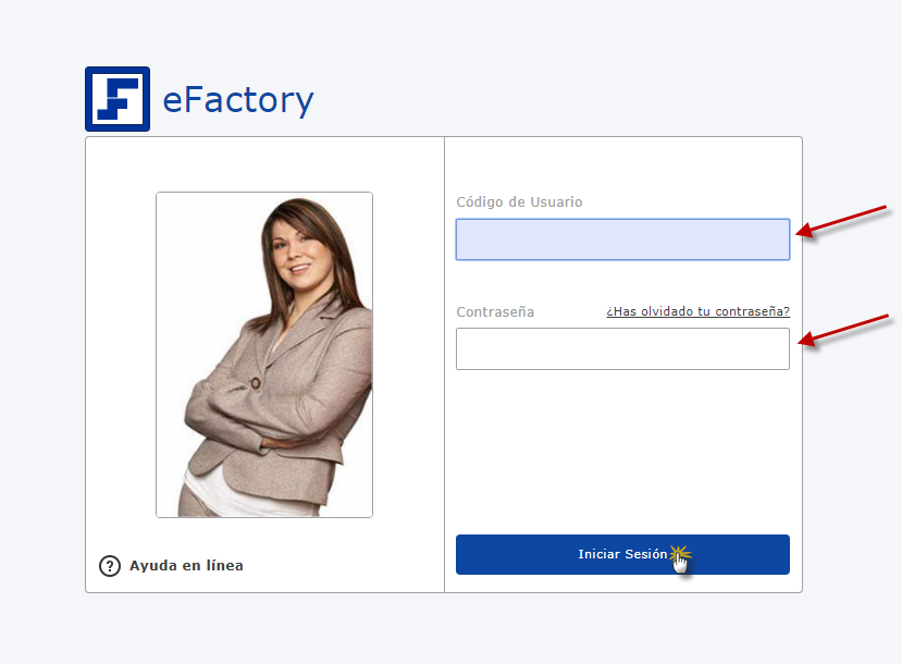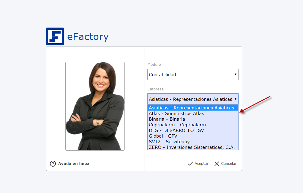 Primero ingresaremos al sistema de contabilidad de eFactory colocando nuestro usuario y contraseña en la pantalla inicial de eFactory, luego presionaremos el botón "Iniciar Sesión" y seleccionaremos el sistema de "Contabilidad".