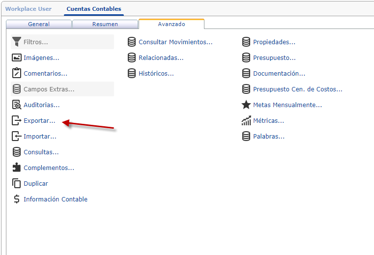 b. Se nos desplegara la pantalla de "Cuentas Contables" en ella iremos a la ficha de "Avanzado" y seleccionaremos "Exportar".