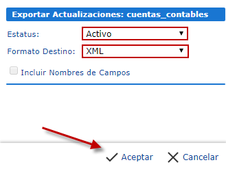 NOTA: Debemos tener en cuenta el "Estatus" del archivo que deseamos exportar ya que este dependerá de las cuentas que irán en el archivo que se bajara, también tenemos que tener en cuenta el "Formato Destino" ya que este va a ser el tipo de formato en el cual el archivo se bajara.