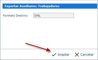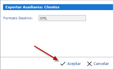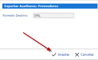 c. Se nos desplegara una ventana en ella deberemos presionar "Aceptar". Se nos exportara un archivo XML, guardaremos este archivo para poder importarlo en "Auxiliares de Contabilidad".