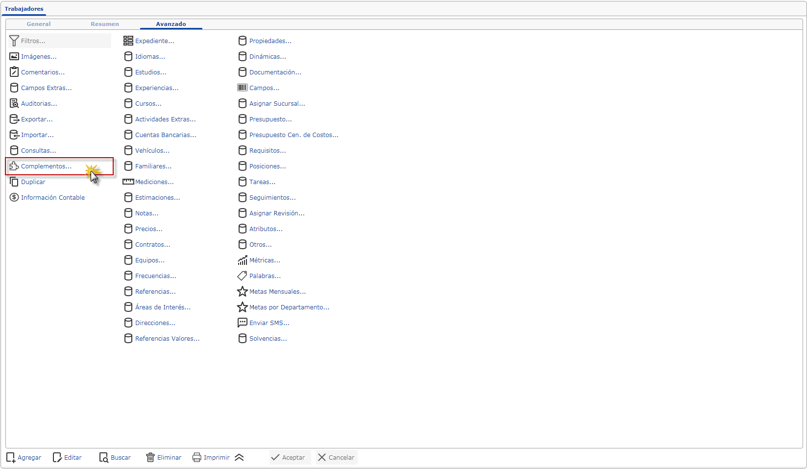 b. Ya dentro de la pantalla de "Trabajadores" seleccionaremos la pestaña "Actualizaciones" y seleccionaremos la opción "Complementos".