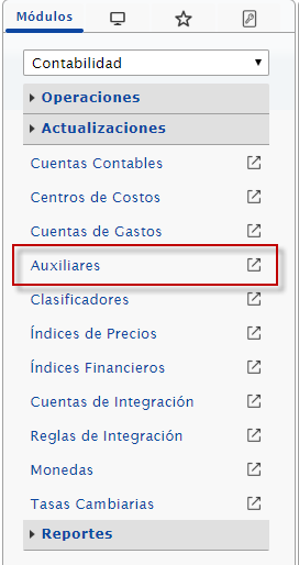 a. Deberemos seleccionar el módulo "Contabilidad" y luego desplegar la seccion de "Actualizaciones" y presionar el opción "Auxiliares"