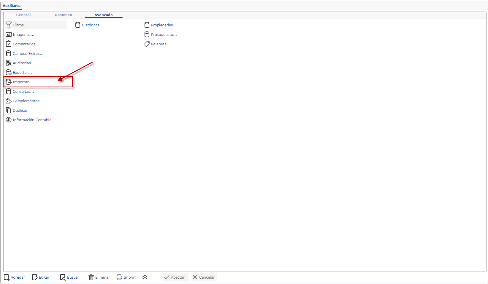 b. Adentro de la pantalla de "Auxiliares" presionaremos la pestaña "Avanzado", luego de esto deberemos presionar la opción "Importar"