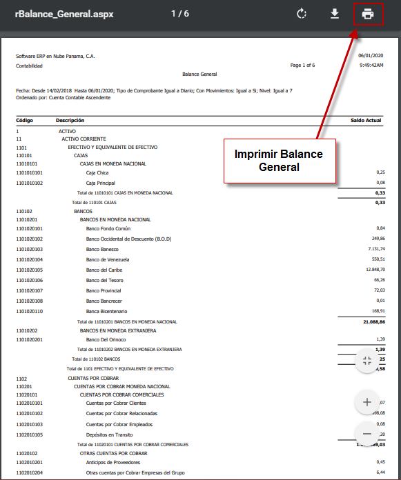 c. Luego se nos desplegara una ventana en la cual podremos ver una vista previa del reporte de "Balance General". para imprimirlo solo deberemos presionar el botón con forma de impresora en la parte superior de la ventana.