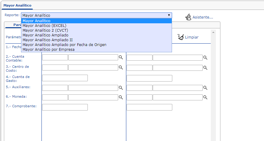 a. Cuando seleccionemos "Mayor Analítico" se nos desplegara un panel, donde deberemos abrir la lista desplegable como muestra la imagen y seleccionaremos "Mayor Analítico"