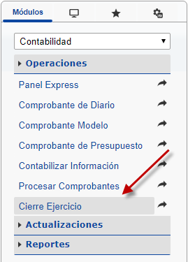 a. Primero deberemos seleccionar el módulo de Contabilidad, y desplegaremos la sección "Operaciones" y presionaremos la opción "Cierre Ejercicio".