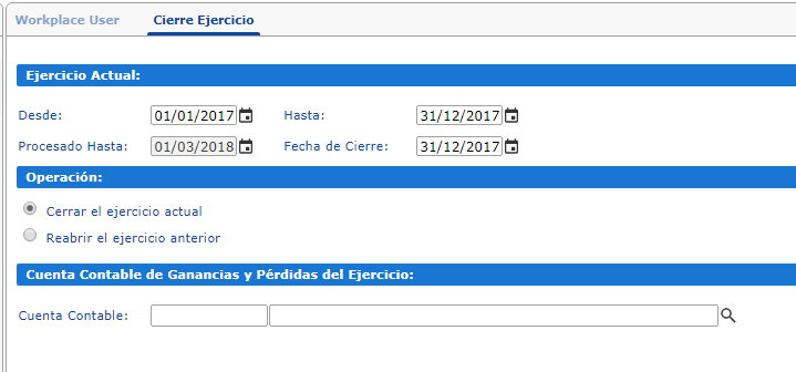 • Operación: Aqui seleccionaremos si queremos cerrar el Ejercicio parametrizado en la seccion anterior o reabrir un ejercicio anterior.