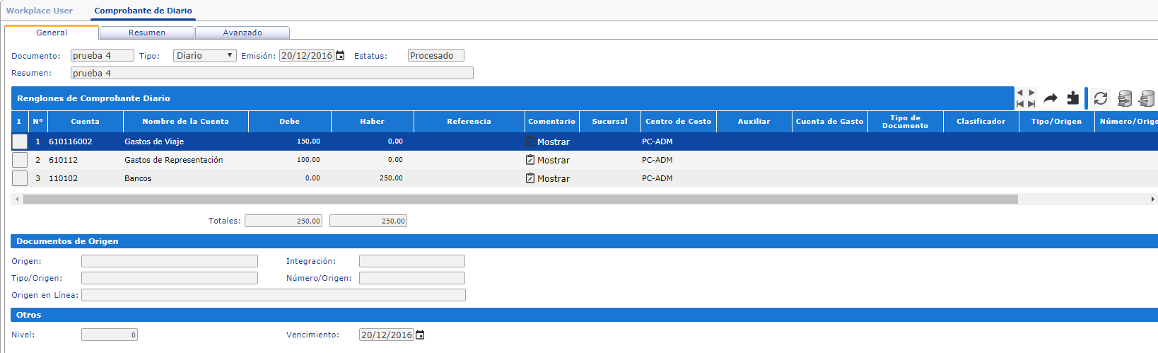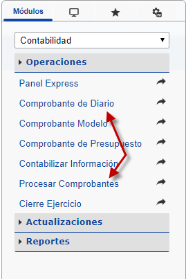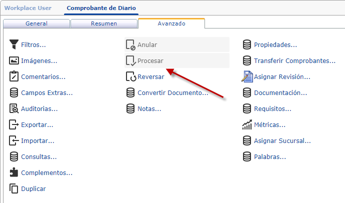 b. Para procesar comprobantes individualmente usaremos la opción "Comprobante de Diario" en esta nos mostrara con detalle todas los comprobantes hechos hasta el momento, para procesar el comprobante seleccionado solo deberemos ir a la ficha de avanzados y presionaremos la opción "Procesar"