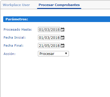 a. una ves seleccionada la opción "Procesar Comprobantes", estableceremos los parametros que se muestran en pantalla. Seleccionaremos la fecha inicial (Desde donde queremos tomar los documentos), la fecha final (Hasta donde queremos tomar los documentos) y la fecha "Procesado Hasta" solo nos mostrara hasta donde han sido procesados los comprobantes.