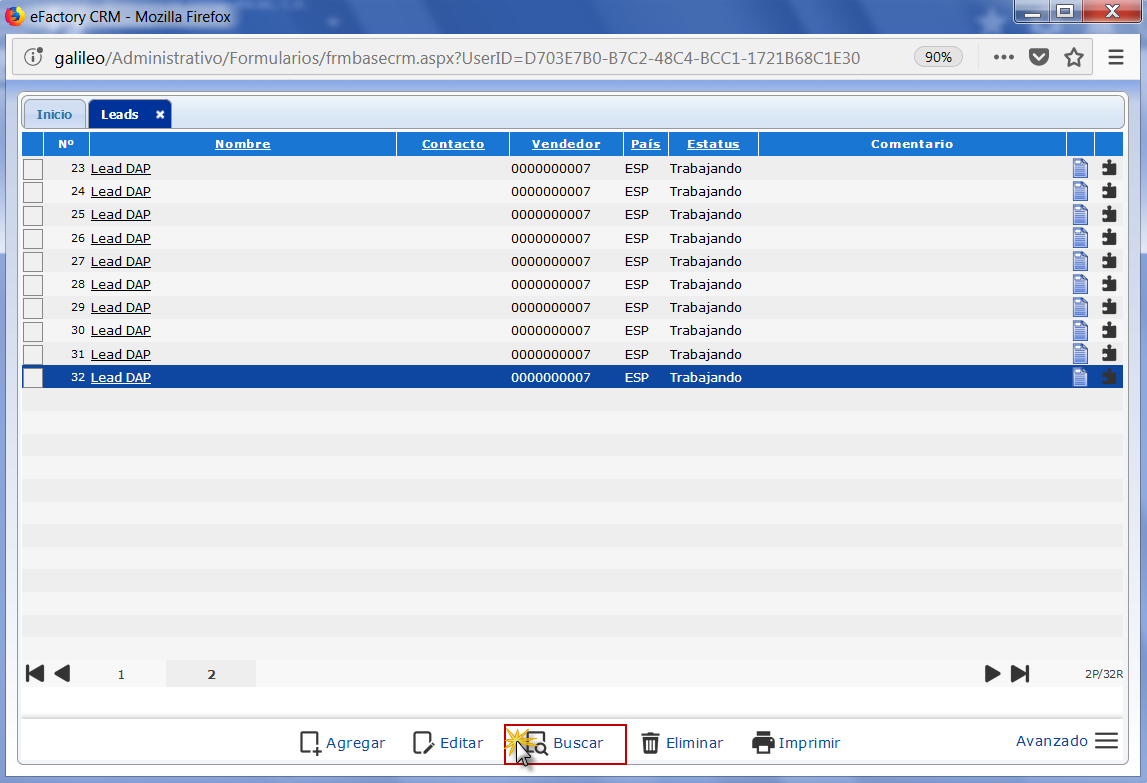 a. Se muestra la ventana Leads, aquí vemos una lista con los Leads ya registrados, presionamos el botón