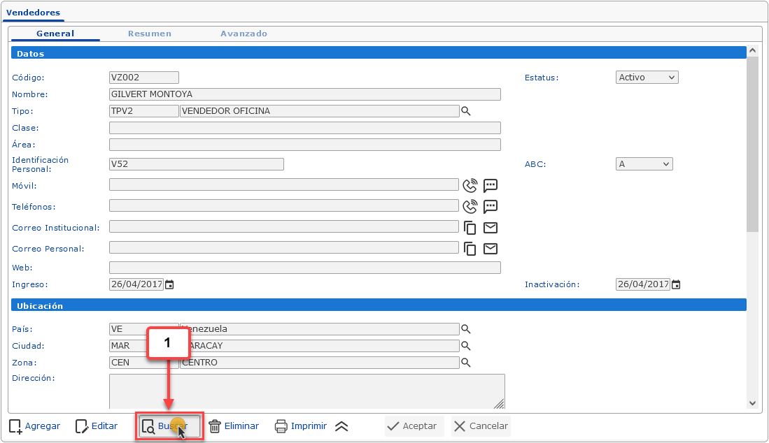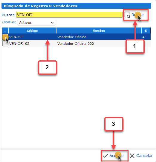 se abrirá la pantalla de Búsqueda: Vendedores, en esta debemos buscar y seleccionar el Vendedor