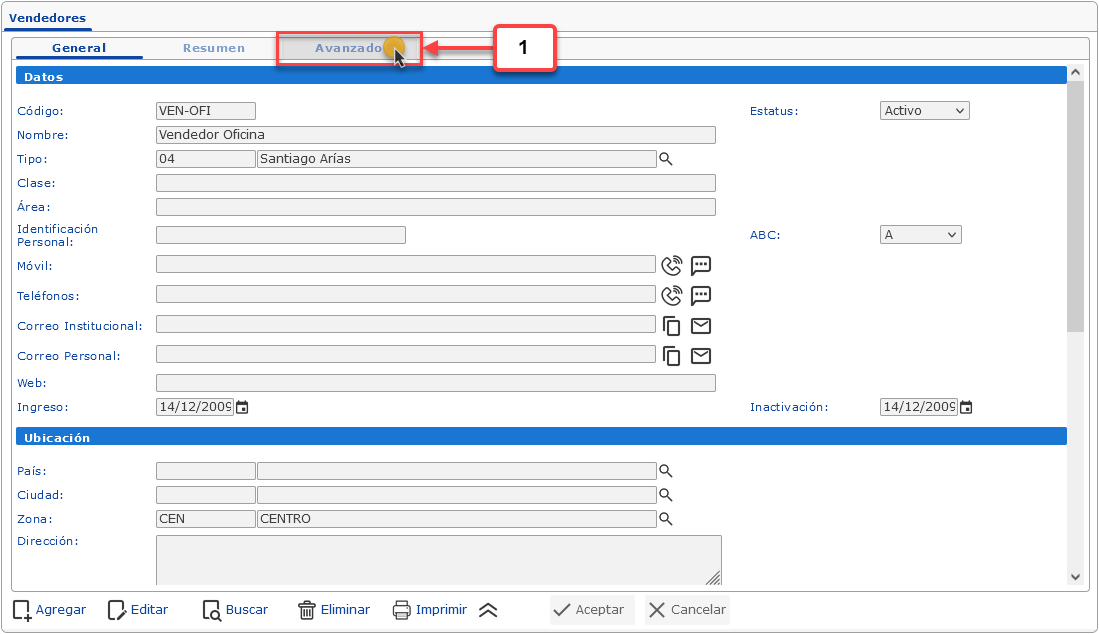 a. Al seleccionar el Vendedor, debemos hacer clic en la pestaña Avanzado.