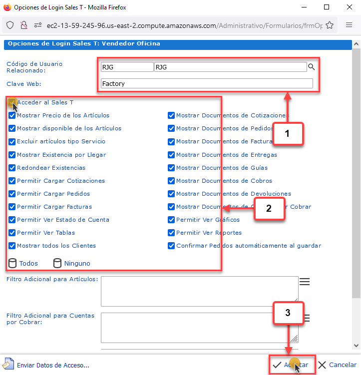 se mostrará el formulario de Opciones de Login Sales T, en este deben:
