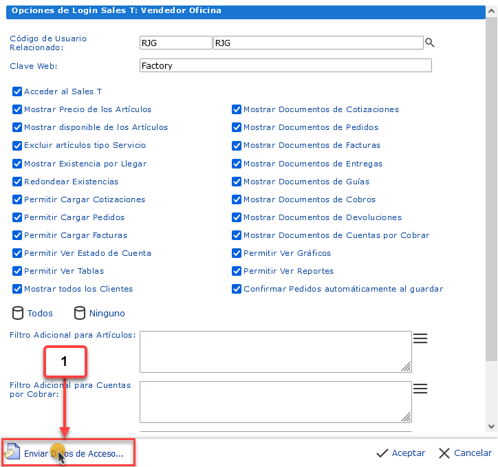 se abrirá la pantalla Enviar Datos de Acceso SalesT
