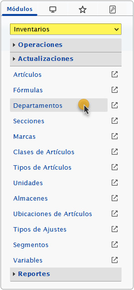 a. Despues de configurar los Vendedores podemos configurar los Departamentos y para esto debemos seleccionar el módulo Inventarios y al desplegar la sección de Actualizaciones seleccionaremos la opción de Departamentos.