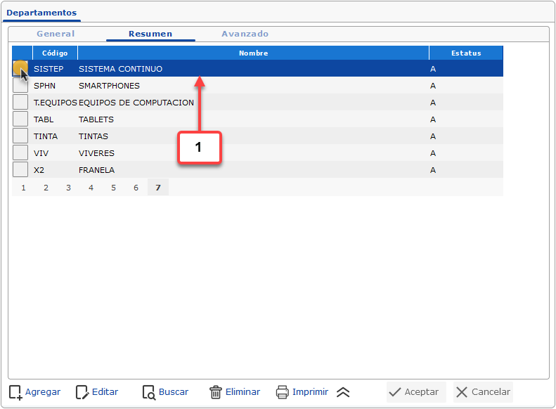 a. Luego de haber seleccionado la opción de Departamentos se muestra la pantalla donde debemos buscar y seleccionar el departamento que deseamos configurar, para esto debemos hacer clic en la pestaña Resumen.