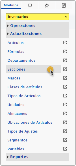 a. Despues de configurar los Departamentos podemos configurar las Secciones y para esto debemos seleccionar el módulo Inventarios y al desplegar la sección de Actualizaciones seleccionaremos la opción de Secciones.