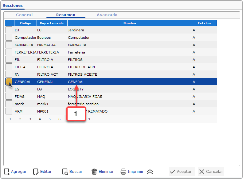 a. Luego de haber seleccionado la opción de Secciones se muestra la pantalla donde debemos buscar y seleccionar la sección que deseamos configurar, para esto debemos hacer clic en la pestaña Resumen.