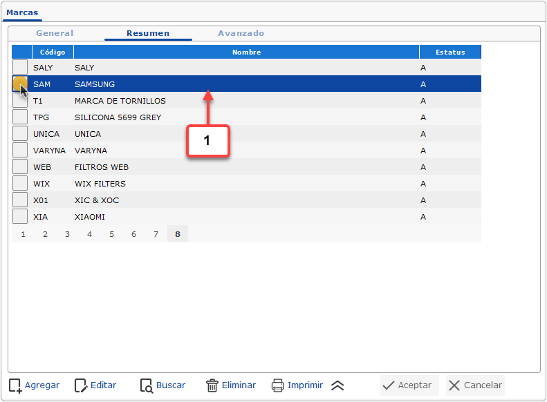 a. Luego de haber seleccionado la opción de Marcas se muestra la pantalla donde debemos buscar y seleccionar la marca que deseamos configurar, para esto debemos hacer clic en la pestaña Resumen.