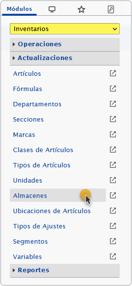 a. Despues de configurar los Marcas podemos configurar las Almacenes y para esto debemos seleccionar el módulo Inventarios y al desplegar la sección de Actualizaciones seleccionaremos la opción de Almacenes.