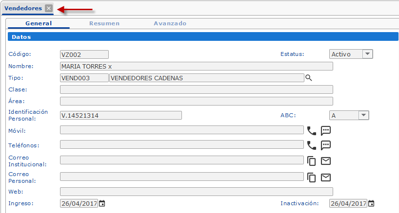 a. En la ficha General se muestran habilitados los campos del nuevo registro Vendedor, procedemos a especificar la siguiente información: