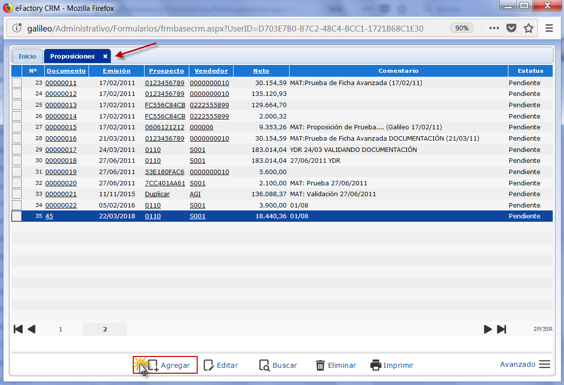 a. Se muestra la ventana Proposiciones, aquí vemos una lista con los registros existentes, presionamos el botón