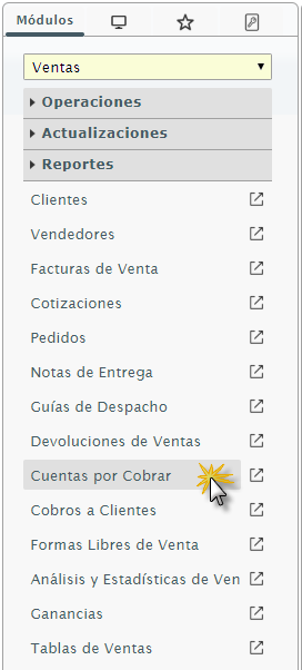 b. Luego de ingresar en el sistema ubicaremos el módulo Ventas, desplegamos el componente Reportes, activamos el sub componente Cuentas por Cobrar