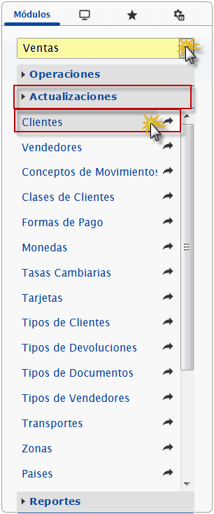 b. En el módulo Ventas, desplegamos el componente Actualizaciones y activamos el sub componente Clientes.