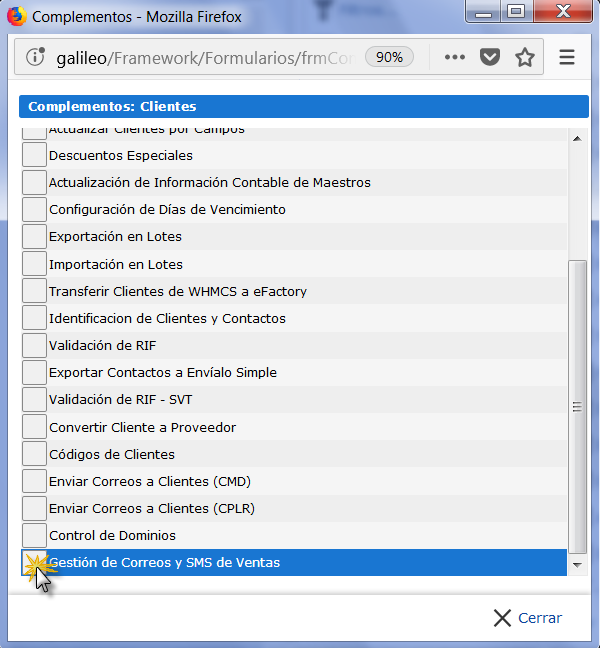 b. Se muestra un listado con los Complementos disponibles, allí ubicamos la opción Gestión de Correos y SMS de Ventas y la activamos en el recuadro ubicado a la izquierda de cada registro.